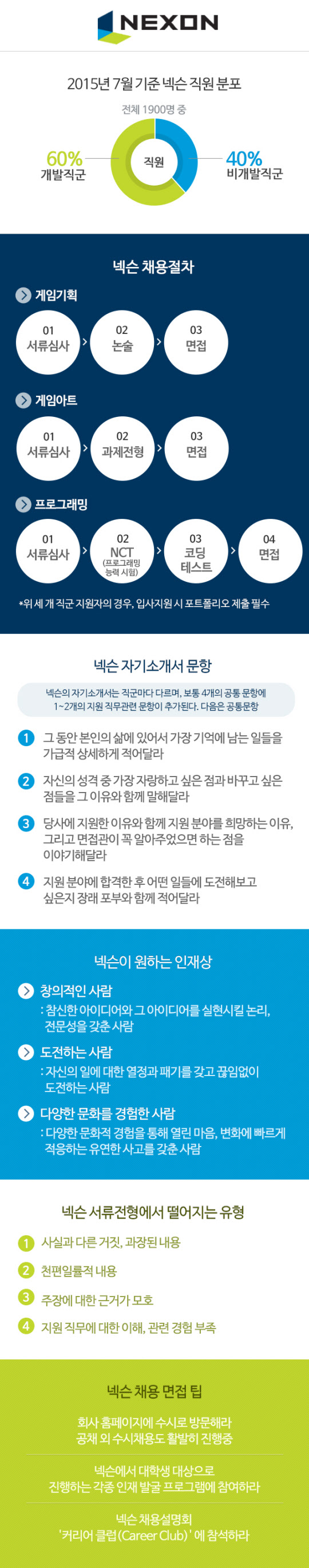 ³Ø½¼ÀÇ Ã¤¿ëÀüÇüÀº ÁøÇà½Ã±â, ¹æ½Ä, Á÷±º¿¡ µû¶ó Â÷À̰¡ ÀÖ´Ù. ÇϹݱ⠽ÅÀÔ°øÃ¤¿¡¼ °ÔÀÓ °³¹ß¿¡ Á÷Á¢ Âü¿©ÇÏ´Â ÇÙ½É Á÷±ºÀÎ ¡®°³¹ßÁ÷±º(°ÔÀÓ ±âȹ, ¾ÆÆ®, ÇÁ·Î±×·¡¹Ö Á÷±º)¡¯ À§ÁַΠä¿ë°úÁ¤À» ¼³¸íÇÏ¸é ´ÙÀ½°ú °°´Ù. ³Ø½¼ÀÇ °³¹ßÁ÷±º ä¿ëÀº ¼·ù½É»ç, °úÁ¦ÀüÇü ¶Ç´Â Å×½ºÆ®, ¸éÁ¢ ¼øÀ¸·Î ÁøÇàµÈ´Ù.