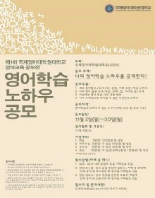 ¿µ¾îÇнÀ ¹× ¿µ¾î°øºÎ¿¡ °üÇÑ ³ëÇϿ츦 °øÀ¯ÇÏ¿© È¿°úÀûÀÎ Çѱ¹ÀÎÀÇ ¿µ¾îÇнÀÀ» µµ¸ðÇϰíÀÚ ±¹Á¦¿µ¾î´ëÇпø´ëÇб³´ÂÁ¦1ȸ ¿µ¾î±³À° °ø¸ðÀü: ³ªÀÇ ¿µ¾îÇнÀ ³ëÇϿ츦 °ø°³ÇÑ´Ù! ¸¦ °³ÃÖÇÕ´Ï´Ù.