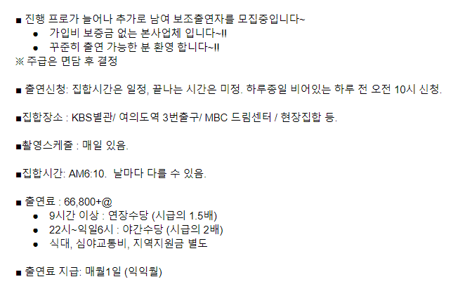 ÇÏ·ç º¸Á¶Ã⿬À» ÇÏ¸é ±âº»±ÞÀ¸·Î 8½Ã°£¾îÄ¡ÀÇ ÃÖÀú½Ã±ÞÀÎ 6¸¸6800¿ø(2019³â ±âÁØ)À» ¹Þ´Â´Ù. ÈްԽð£ 1½Ã°£À» Æ÷ÇÔÇØ 9½Ã°£ ÃÔ¿µÀ» °¡Á¤ÇÑ °ÍÀÌ´Ù. À̶§ ¹Þ´Â µ·Àº 1½Ã°£¸¸¿¡ ÃÔ¿µÀÌ ³¡³ªµµ, 9½Ã°£µ¿¾È ÃÔ¿µÀÌ À̾îÁ®µµ ¶È°°´Ù. ±×·¡¼ ´©±º°¡¿¡°Õ ¡®²Ü¾Ë¹Ù¡¯Àϼöµµ, ´Ù¸¥ ´©±º°¡¿¡°Õ ¡®±ØÇѾ˹١¯Àϼöµµ ÀÖ´Ù.