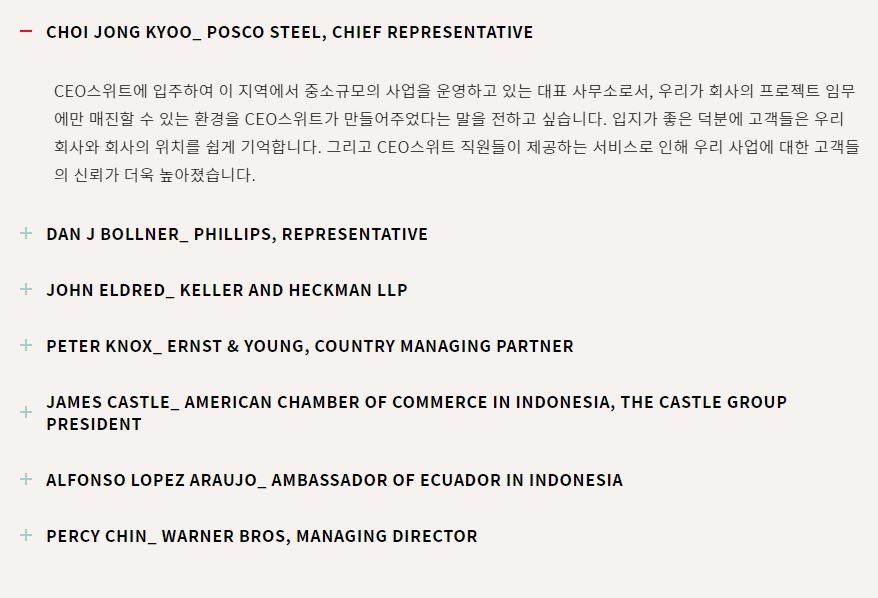 CEO½ºÀ§Æ®´Â ÆäÀ̽ººÏ¡¤¿ì¹ö¡¤¸¶ÀÌÅ©·Î¼ÒÇÁÆ®¡¤º£ÀξØÄÄÆÛ´Ï µî ±Û·Î¹ú ±â¾÷ÀÌ ÁÖ °í°´ÀÌ´Ù. À̵éÀÌ ´Ù¸¥ °øÀ¯ ¿ÀÇǽºº¸´Ù ¾à 2¹è ºñ½Ñ ÀÓ´ë·á¸¦ ³»¸é¼ CEO½ºÀ§Æ®¸¦ ã´Â ÀÌÀ¯°¡ ÀÖ´Ù. »ç¹«°ø°£À» ºô·ÁÁÖ´Â °Í»Ó¸¸ ¾Æ´Ï¶ó ȸ»ç ¿î¿µ¿¡ ÇÊ¿äÇÑ Àü¹®ºñ¼¡¤¹ý·ü¡¤È¸°è¡¤Å뿪 µî °¢Á¾ ÇÁ¸®¹Ì¾ö ¼ºñ½º¸¦ ÇÔ²² Á¦°øÇÑ´Ù.
