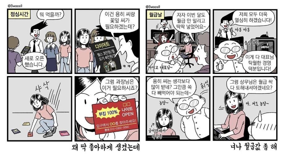 À¥Å÷¿¡´Â ¡°À̹ø´Þµµ ¿ù±Þ ¾È ¹Ð¸®°í µüµü ³Ö¾ú´Ù¡±°í »ý»ö³»´Â ´ëÇ¥°¡ µîÀåÇÑ´Ù. ¿·¿¡ ÀÖ´ø »ó¹«°¡ ¡°´ëÇ¥´ÔÀÇ Å¹¿ùÇÑ °æ¿µ ´öºÐÀÔ´Ï´Ù¡±¶ó°í ¾ÆºÎ¸¦ ¶²´Ù. ±×·¯¸é¼ ÁÖÀΰø¿¡°Ô ¡°¿ù±Þ ¹Þ´Â ¸¸Å ½ï »©¸Ô¾î¾ß Çϴµ¥¡±¶ó°í ÇÑ´Ù. ±×·¯ÀÚ ÁÖÀΰøÀº ¡°»ó¹«´ÔÀº ¿ù±Þ ´Ù ÅäÇØ³»¼Å¾ß°Ú³×¿ä¡±¶ó°í ½î¾ÆºÙÀδÙ. ´ñ±Û¿¡¼± ¡®»çÀÌ´Ù ³¯¸®´Â ÁÖÀΰø¡¯, ¡®¿ä¾çº´¿ø¿¡¼ ÀÏÇߴµ¥ ÁÖÀΰø¿¡ °ø°¨ÇÑ´Ù¡¯ µîÀÇ ¹ÝÀÀÀÌ ³ª¿Ô´Ù.