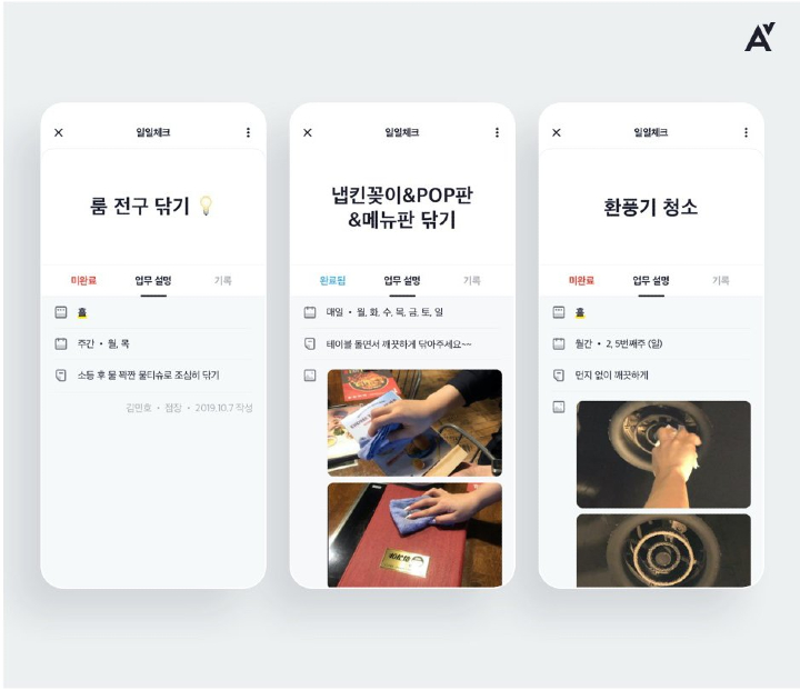 °¨Á¤¼Ò¸ð¸¦ ÁÙÀÌ°í ¼·Î ¹Ï°í Áñ°Ì°Ô ÀÏÇÏ°í ½Í¾ú´Ù. ½º¸¶Æ®ÆùÀ» ÀÌ¿ëÇÏ¸é °¡´ÉÇÏÁö ½Í¾ú´Ù. ÀÌ·¸°Ô ¶°¿Ã¸° ¾ÆÀ̵ð¾î°¡ ¼÷¼º °úÁ¤À» °ÅÃÄ Áö±ÝÀÇ ¾Ë¹Ùüũ·Î ´Ù½Ã ž´Ù. ¾Ë¹Ùüũ ±â´ÉÀº Å©°Ô 3°¡Áö´Ù. ù¹øÂ° üũ¸®½ºÆ®´Ù. °ü¸®ÀÚ°¡ ÇØ¾ß ÇÒ ÀÏÀ» ÀÛ¼ºÇÏ°í ¸ÅÀÏ È¤Àº ¿äÀϺ° ¹Ýº¹, ½Ã°£°ú ´ã´ç Á÷¿ø ÁöÁ¤ÇÑ´Ù. ¾Ë¹Ù»ýÀº À̸¦ º¸°í ÀÏ ÇÑ µÚ ÀÎÁõ¼¦À» Âï°Å³ª ´ñ±Û·Î º¸°í¸¦ ÇÑ´Ù. µÎ¹øÂ° °øÁö»çÇ× ±â´ÉÀÌ´Ù. ƯÀÌ»çÇ×, °íÀå ³»¿ª, ½ºÄÉÁÙÀ» ±â·ÏÇÒ ¼ö ÀÖ´Ù. ¸¶Áö¸·À¸·Î Á÷¿øÀÌ ¿Ã¸° ³»¿ëÀ» º¸Áö ¾ÊÀ¸¸é Ǫ½Ã ¾Ë¸²À» º¸³» È®ÀÎÇϵµ·Ï À¯µµÇÏ´Â ±â´ÉÀÌ´Ù. 2019³â 3¿ù º£Å¸ ¼ºñ½º¸¦ ½ÃÀÛÇß´Ù. ±×ÇØ 9¿ù¿£ ¾Ë¹Ùüũ¸¦ ÀÚ±â°í ÀºÇà±Çû³ââ¾÷Àç´Ü µðÄ·ÇÁ°¡ °³ÃÖÇÑ 10¿ù µðµ¥ÀÌ¿¡¼ ¿ì½Â(»ê¾÷Åë»êºÎ Àå°ü»ó)À» Â÷ÁöÇØ »ó±Ý 1000¸¸¿øÀ» ¹Þ±âµµ Çß´Ù. µðµ¥À̴ â¾÷ ¾ÆÀ̵ð¾î, ¾ÆÀÌÅÛÀÌ ´õ ¿ì¼öÇÑ Áö °Ü·ç´Â Çà»ç´Ù.