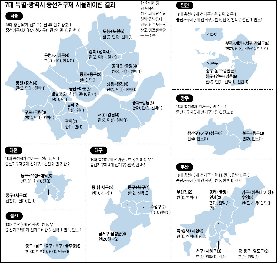 ¡ßºÎ»ê¡¤´ë±¸¡¤¿ï»ê=18´ë ÃѼ±¿¡¼ Çѳª¶ó´çÀº ºÎ»ê Àüü 18¼®Áß 11¼®À» Â÷ÁöÇß°í, ¹«¼Ò¼ÓÀÌ 5¼®, Ä£¹Ú¿¬´ë°¡ 1¼®À» ¾ò¾ú´Ù. Áß¼±°Å±¸Á¦¿¡¼± Çѳª¶ó´ç ÀǼ®ÀÌ 8¼®À¸·Î ÁÙ°í Ä£¹Ú¿¬´ë°¡ 6¼®, ¹ÎÁÖ´çÀÌ 4¼®À̾ú´Ù. ´ë±¸ÀÇ °æ¿ì, 18´ë ÃѼ± ¶§ Àüü 12¼® Áß 8¼®ÀÌ Çѳª¶ó´çÀ̾ú°í, Ä£¹Ú¿¬´ë 3¸í°ú ¹«¼Ò¼Ó 1¸íÀ̾ú´Ù. ´ë±¸¿¡¼± Áß¼±°Å±¸Á¦¸¦ µµÀÔÇØµµ º° Â÷À̰¡ ¾ø¾ú´Ù. Çѳª¶ó´çÀÌ 6¼®, Ä£¹Ú¿¬´ë°¡ 6¼®À̾ú°í ¹ÎÁÖ´çÀº ÀǼ®À» Â÷ÁöÇÏÁö ¸øÇß´Ù. Àüü ÀǼ®ÀÌ 6¼®ÀÎ ¿ï»êÀº Áö³ ÃѼ±¶§ Çѳª¶ó´çÀÌ 5¼®, ¹«¼Ò¼ÓÀÌ 1¼®À» °¡Á®°¬´Ù. ±×·¯³ª Áß¼±°Å±¸Á¦¿¡¼± Çѳª¶ó´çÀÌ 3¼®À¸·Î ÁÙ°í, ¹ÎÁÖ´ç, ¹Î³ë´ç, Ä£¹Ú¿¬´ë°¡ °¢°¢ 1¼®À» ¾ò¾ú´Ù.