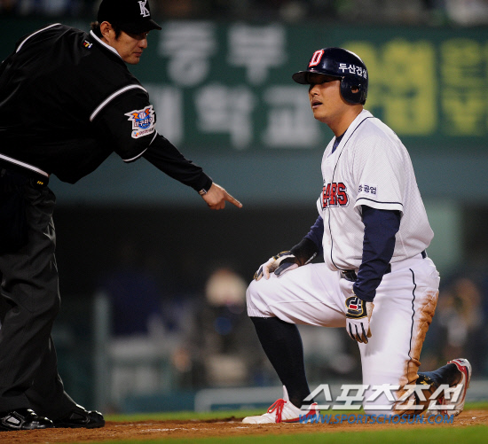 11ÀÏ Àá½Ç¿¡¼ ¹ú¾îÁø µÎ»ê°ú »ï¼ºÀÇ PO 4Â÷Àü 6ȸ¸» 1»ç 1,2·ç¿¡¼ 2·çÁÖÀÚ ±èµ¿ÁÖ°¡ ¼Õ½ÃÇåÀÇ Àû½ÃŸ ¶§ ȨÀ¸·Î ¶Ù¾î µé¾úÁö¸¸ Áø°©¿ëÀÌ ¹öƼ°í ÀÖ´ø ÈìÇ÷¹ÀÌÆ®¸¦ ¹âÁö ¸øÇØ ¾Æ¿ôµÇ°í ¸»¾Ò´Ù. ±èµ¿ÁÖ°¡ ¾Æ¿ôÆÇÁ¤¿¡ Ç×ÀÇÇØ º¸Áö¸¸ ³ª±¤³² ÁÖ½ÉÀÌ È¨Ç÷¹ÀÌÆ®¸¦ °¡¸®Å°¸ç ¾Æ¿ôÀ» È®ÀνÃÄÑ ÁÖ¾ú´Ù.