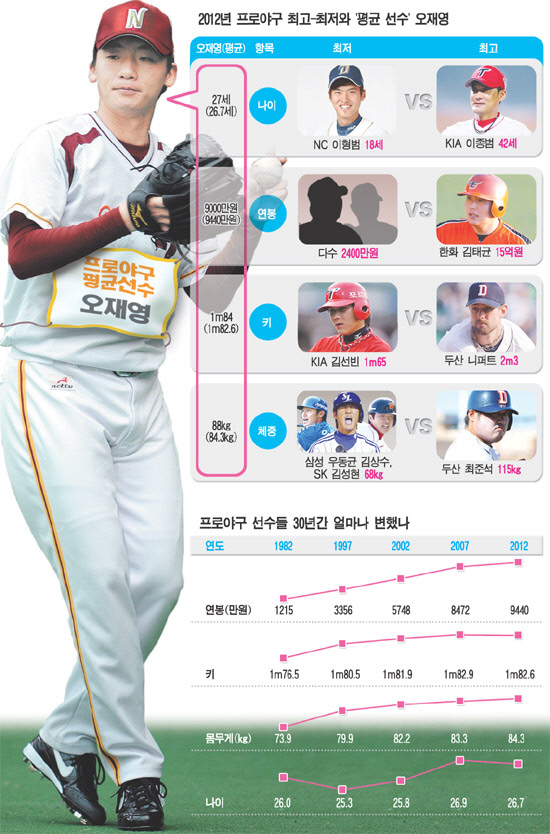 ±×·¸´Ù¸é ÃÖ°íÀÇ Àα⠽ºÆ÷Ã÷ÀÎ ÇÁ·Î¾ß±¸ ¼±¼öµéÀÇ Æò±Õ°ªÀº ¾ó¸¶³ª µÉ±î. Çѱ¹¾ß±¸À§¿øÈ¸(KBO)´Â ÃÖ±Ù 2012³â ÇÁ·Î¾ß±¸ µî·Ï¼±¼ö 530¸í(NC Æ÷ÇÔ)ÀÇ ½ÅüÁö¼ö¿Í ¿¬ºÀ, ³ªÀÌ µîÀ» ´ãÀº ÀڷḦ ¹ßÇ¥Çß´Ù. ÀÌ¿¡ µû¸£¸é ´ëÇѹα¹ ÇÁ·Î¾ß±¸ ¼±¼öµéÀÇ Æò±Õ°ªÀº °¢°¢ ½ÅÀå 1m82.6, ¸ö¹«°Ô 84.3§¸, Æò±Õ¿¬ºÀ 9440¸¸¿øÀ¸·Î ³ªÅ¸³µ´Ù. Æò±Õ ³ªÀÌ´Â 26.7¼¼À̰í, Æò±Õ ¿¬Â÷´Â 7.8³âÂ÷ÀÌ´Ù. ¿¹»óÇß´ø´ë·Î ÀϹÝÀΰú ºñ±³ÇØ ½Åüµµ Å©°í, ¿¬ºÀµµ ¸¹´Ù.