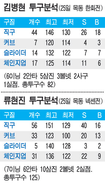 ±èº´ÇöÀÇ À̳¯ ¼ºÀûÀº 6ÀÌ´× 2¾ÈŸ 4»ç±¸ 5°³ 5Å»»ïÁø 1½ÇÁ¡. Áö³ 18ÀÏ »ï¼ºÀü¿¡¼ ¿Ã½ÃÁð ù ¼±¹ß µîÆÇÇßÀ» ¶§ ¼ºÀû(4¨øÀÌ´× 6¾ÈŸ 6Å»»ïÁø 3½ÇÁ¡)º¸´Ù °Ñº¸±â¿¡µµ Çâ»óµÆ´Ù. ±èº´ÇöÀº À̳¯ Åõ±¸¼ö °ü¸®¿¡ ÃÖÀûÀÇ ¸ð½ÀÀ» º¸¿´´Ù. 18ÀÏ 96°³ÀÇ º¼À» ´øÁ³Áö¸¸ À̳¯Àº 82°³·Î ÄÁµð¼ÇÀ» Á¶ÀýÇß´Ù. ´ë½Å ¼ÒÈÇÑ ÀÌ´×¼ö´Â 1¨÷ÀÌ´× ´õ ¸¹¾Ò´Ù. Á÷±¸ ÃÖ°í¼Óµµ 146§°, ÃÖÀú 130§°·Î, 18ÀÏ(133¡147§°)¿¡ ºñÇØ º° Â÷À̰¡ ¾ø¾ú´Ù. ±¸Á¾ ¿ª½Ã Á÷±¸¸¦ Áß½ÉÀ¸·Î üÀÎÁö¾÷(17°³), ½½¶óÀÌ´õ(14°³), Ä¿ºê(7°³)ÀÇ ºÐÆ÷¸¦ À̹ø ¼±¹ß µîÆÇ¶§¿Í ºñ½ÁÇÏ°Ô °¡Á®°¬´Ù. ƯÈ÷ ±èº´ÇöÀº À§±â°ü¸®¿¡¼ °ÇÑ ¸é¸ð¸¦ ÀÚ¶ûÇß´Ù. 1ȸÃʺÎÅÍ »ì¦ ºÒ¾È°¨À» ¾È°ÜÁá´Ù. ¼±µÎŸÀÚ °µ¿¿ì¸¦ 1·ç ¶¥º¼·Î ó¸®ÇÏ¸ç ¼øÁ¶·Ó°Ô Ãâ¹ßÇϴ°¡ ½Í´õ´Ï ÇÑ»óÈÆ°ú À强ȣ¿¡°Ô ¿¬¼Ó ¸ö¿¡ ¸Â´Â º¼À» ³»Áá´Ù. ¿ì¿Ï »çÀ̵å¾ÏÀÌ¾î¼ ±×·±Áö ÁŸÀÚ »ó´ë Á¦±¸°¡ Èçµé¸®´Â ¸ð½ÀÀ̾ú´Ù. °á±¹ ±èº´ÇöÀº ÀÚÃÊÇÑ ½ÇÁ¡À§±â¿¡¼ ÃÖÁøÇàÀ» »ó´ëÇÏ´ø Áß ÆøÅõ¸¦ ´øÁö´Â ¹Ù¶÷¿¡ ¼±Á¦Á¡À» Çå³³ÇÏ°í ¸»¾Ò´Ù. ÇÏÁö¸¸ À§±â´Â ¿©±â±îÁö¿´´Ù. ÀÌÈÄ ±èº´ÇöÀº ¸ÂÇôÀâ´Â ÇÇĪÀ» Áß½ÉÀ¸·Î ¸ÅÀÌ´× »ïÁøÀ» ¼¯¾î°¡¸ç ÇÑÈ Å¸¼±À» ¾ÐµµÇØ ³ª°¬´Ù. ±èº´ÇöÀÌ À̳¯ 24¸íÀÇ Å¸ÀÚ¸¦ »ó´ëÇÏ´Â µ¿¾È Àý¹ÝÀ» ¹üŸ À¯µµ¸¦ ÅëÇØ ¾Æ¿ô Ä«¿îÆ®¸¦ Àâ¾Ò´Ù. ÇöóÀ̺¼¿Í ¶¥º¼ÀÌ °¢°¢ 6°³·Î °í¸£°Ô ºÐÆ÷µÆ´Ù. Ãʹݿ¡ Àá±ñ À§±â¸¦ ÃÊ·¡ÇßÀ» »Ó