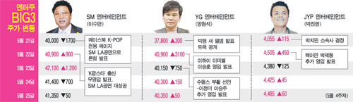JYP, YG´Â 'KÆË½ºÅ¸' ¿µÀÔ ¹ßÇ¥ ÈÄ Á¤µµ Â÷ÀÌ´Â ÀÖÁö¸¸ ÁÖ°¡ ±ÞµîÀ» °æÇèÇß´Ù. 22ÀÏ ´ç½Ã YG´Â 8.2% ¿À¸¥ 4¸¸900¿øÀ» ±â·ÏÇß´Ù.