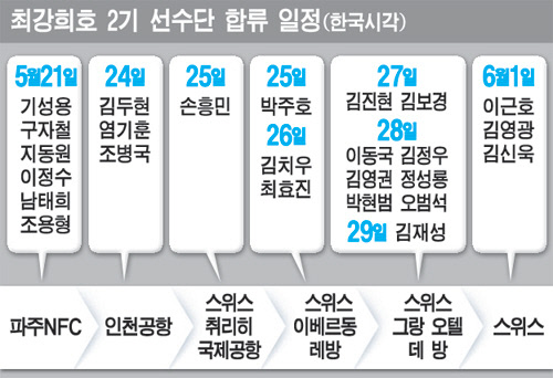 ´ëÇÑÃ౸Çùȸµµ À̵éÀÇ ºü¸¥ ÇÕ·ù¸¦ ÃßÁøÇß´Ù. ±ºÀÎÀÌ ÇØ¿Ü¿¡ ³ª°¡±â À§Çؼ´Â °ü¿µ¿©±Ç(´Ü¼ö¿©±Ç)ÀÌ ÇÊ¿äÇѵ¥ ±¹±ºÃ¼À°ºÎ´ë, ±¹¹æºÎ µîÀÇ ½ÂÀÎÀ» °ÅÄ¡·Á¸é 10ÀÏ °¡±îÀÌ ½Ã°£ÀÌ °É¸®±â ¶§¹®¿¡ 21ÀÏ Æ¯´ÜÀÇ Á¶Ä¡·Î ÀϹݿ©±ÇÀ» ½ÅÃ»ÇØ ¹ß±Þ ¹Þ¾Ò´Ù. ÃÖÈ¿Áø°ú ±èÄ¡¿ì´Â 25ÀÏ ½ºÀ§½ºÇà ºñÇà±â¿¡ ¿Ã¶ó 26ÀÏ ¼±¼ö´Ü¿¡ ÇÕ·ùÇß´Ù. ÇØ¿ÜÆÄº¸´Ù ½ºÀ§½º¿¡ ÇÏ·ç ´Ê°Ô ÀÔ¼ºÀ» ÇßÁö¸¸ ´Ù¸¥ K-¸®°Å¿¡ ºñÇϸé ÀÌÆ² ´õ Àü¼ú ÈÆ·Ã¿¡ Âü°¡ÇÒ ¼ö ÀÖ´Â ½Ã°£ÀÌ »ý°å´Ù. '¼±¼ö³'¿¡ ½Ã´Þ¸®´ø ÃÖ °¨µ¶À¸·Î¼± ¶§¿¡ ¸ÂÃç ³ª¿Â'°æ°í ´©Àû'ÀÌ °í¸¶¿ï »ÓÀÌ´Ù. ÃÖ °¨µ¶ 27ÀÏ ½ºÀ§½º À̺£¸£µ¿ ·¹ ¹æ¿¡¼ ¿¸° ´ëÇ¥ÆÀ ÈÆ·Ã¿¡¼ ½ºÆäÀÎÀü ÃâÀü °¡´É¼ºÀÌ ³ôÀº ¼±¼öµé·Î ÈÆ·ÃÀ» ÁøÇàÇß´Ù. ±èÄ¡¿ì´Â ¿ÞÂÊ ¹ÌµåÇÊ´õ·Î, ÃÖÈ¿ÁøÀº ¿À¸¥ÂÊ Ãø¸é ¼öºñ¼ö¿¡ ÀÚ¸®Çß´Ù. ½ÃÂ÷ÀûÀÀ ¹× Àå°Å¸® À̵¿À¸·Î ÀÎÇÑ ÇÇ·Î °ÆÁ¤ ¾øÀÌ À̵éÀ» ±â¿ëÇÒ ¼ö ÀÖ°Ô µÈ °ÍÀÌ´Ù.