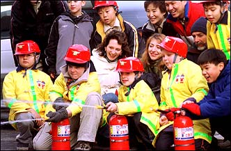 Students at an international school learn to use fire extinguishers at Fire Fighting Experience Program for Foreign Children, hosted by Eunpyeong Fire Station, Seoul Saturday.