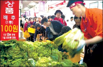 The Grand Mart in Shinchon is offering nine items from produce to clothing at a special discount until December 6. The prices of cabbage, yellow corbina, and bananas are W100 a head, W400, and W80 per 100g, respectively.