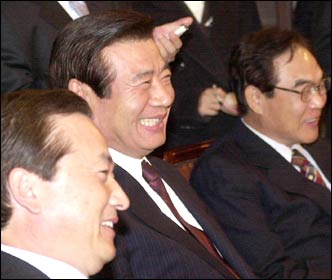 Han Gwang-ok, chairman of the Millennium Democratic Party smiles confidently Thursday while being briefed at the party executive meeting on the impeachment bill against Prosecutor General Shin Seung-nam.