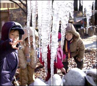 A child reaches out to touch icicles formed on a fountain at Jangeung Park, Gyeonggi Province, Friday, when the temperature dropped below freezing.