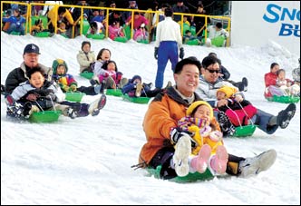 Children enjoy sled rides at Everland, Yongin, Gyeonggi Province, Sunday.
