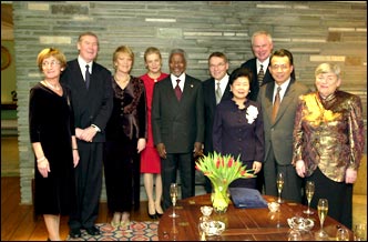 Han Seung-soo (second from the right), Minister of Foreign Affairs and Trade and chairman of the United Nations General Assembly, attends a dinner banquet hosted by the Nobel Foundation, at the Grand Hotel, Oslo, Norway, Sunday. Han will receive the 2001 Nobel Peace Prize on behalf of the United Nations, which will share the honor with its secretary general Kofi Annan.