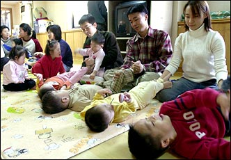 Members of the online volunteer group "The Giving Tree" massage children with cerebral palsy at Sangrakwon, an institution for the physically challenged, Tuesday.