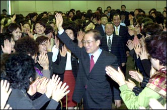 Grand National Party president Lee Hoi-chang salutes his supporters at a female executive party members' rally, held at the party's Yeouido Headquarters, Tuesday.