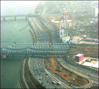 The yellow sand phenomenon covered the country Thursday limiting visibility to only the frames of the Hangang Railway and Hangang Bridges from the nearby 63 Building.