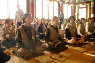 Foreign students studying in Korea taste the essence of traditional Buddhism through Zen meditation practice at the Dabo Discipline Center, Chungbuk Province. Buddhist temples will be open to foreign tourists during the next year's World Cup, through its Temple Stay program.