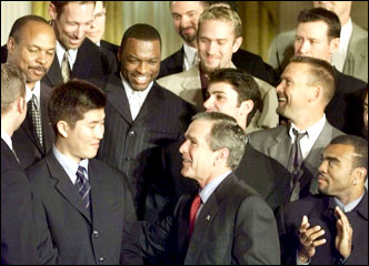 Pitcher Kim Byung-hyun of World Series Champions the Arizona Diamondbacks, meets US President George W. Bush during White House ceremonies, Friday (KST).