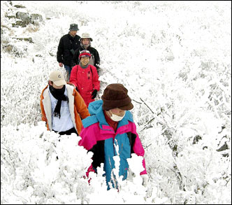 Mount Mudeung, Gwangju, is covered with heavy snow, forming flower-like shapes on trees, startling mountain-goers, Sunday.