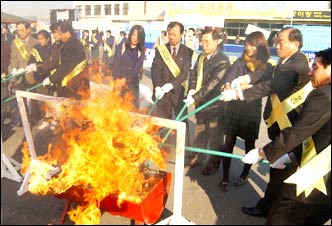 High school students, parents and teachers burn adult publications and videotapes at Daejeon Station Square Monday, as an Environmental Clean-up Drive Campaign for Youth.