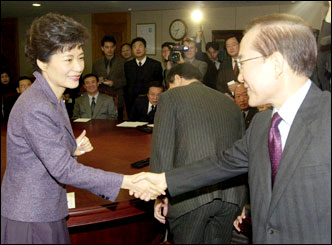 Grand National Party president Lee Hoi-chang shakes hands with party vice president Park Geun-hye, who declared she will compete for the party nomination as presidential candidate, prior to party high executive meeting Monday.