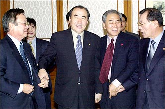 Grand National Party Policy Committee Chairman Kim Man-je, his Millennium Democratic Party counterpart Park Chong-ung, GNP floor leader Lee Jae-oh, and ruling party counterpart Lee Sang-soo gathered Thursday to discuss pending issues at a National Assembly session.