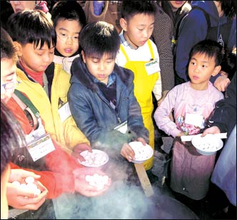 Children make red bean porridge, a traditional dish for Dongji, or winter solstice, at a National Folk Museum-hosted event Thursday.