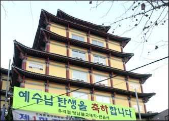 A Buddhist temple in Daegu displays a sign celebrating the birth of Christ, Sunday, two days before Christmas.