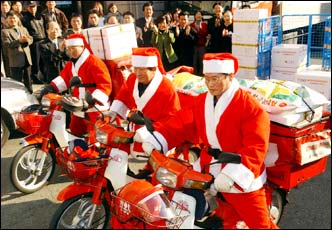Deliverymen dressed as Santa Claus, Monday, to deliver daily necessities, including rice, to children in Busan whom have lost their parents.