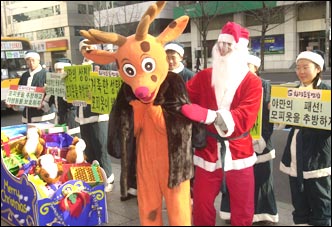 Members of the Federation of Environmental Movements, dressed as reindeer and Santa Clauses, held an anti-fur campaign in front of a department store in Myong-dong Sunday.