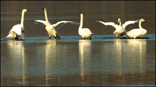 Swans, labeled a National Natural Monument, appeared on the Han River, Seoul Wednesday, as winter deepens.