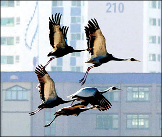 White necked cranes, a designated National Natural Monument, return to Gimpo, Gyeonggi Province, for the seventh year in a row.