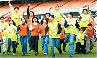Volunteer workers for 2002 Korea-Japan World Cup wish for a successful hosting of the international event at the Daegu World Cup Stadium, Monday.