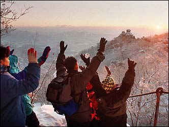 Mountain-goers celebrate the first sunrise of 2002 at Baekundae, atop Mount Bukhan, Seoul, Tuesday.
