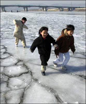 Children play on the ice near the Gangdong Bridge, Seoul, Thursday as the Han River freezes over for the first time this winter.