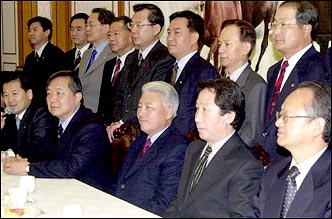 Leaders of progressive and non-mainstream factions of ruling and opposition parties, Chung Dong-young, Chung Dae-chul, Kim Duk-ryong, Kim Keun-tae and Lee Bu-young on the front row from left, gather to discuss constitutional amendments at the National Assembly, Friday.