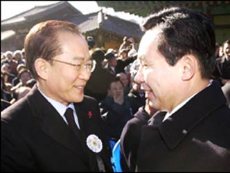 Opposition Grand National Party leader Lee Hoi-chang and ruling Millennium Democratic Party advisor Rhee In-je shake hands at the funeral of Reverend Hyeam held at Haein Temple, Gyeongnam Province, Sunday.