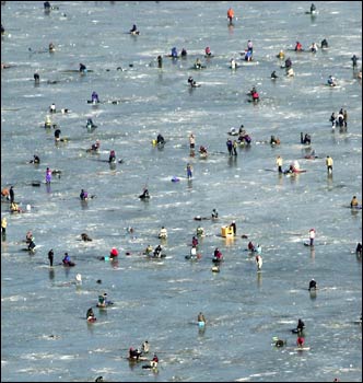 Anglers wrapped in heavy winter clothes cast their lines on the frozen Onyang Reservoir, Chungnam Province, Sunday afternoon.