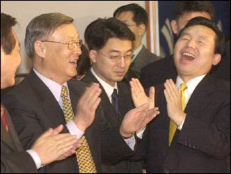 Executives of the ruling Millennium Democratic Party, Rhee In-je and Kim Joong-kwon (from right), show satisfaction after concluding the party's national convention schedule at a meeting Monday.