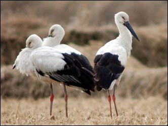 Migratory storks, designated a Natural National Monument, rest in fields in Nonsan, Chungnam, Thursday, as they migrate south as winter deepens.