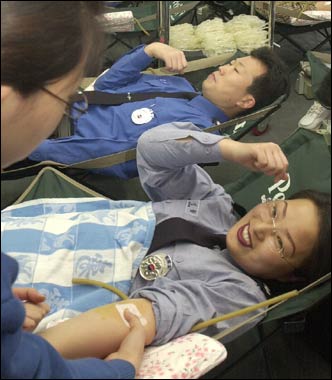 Police officers at Seong Buk station donate blood Thursday amid a shortage of transfusion stock.
