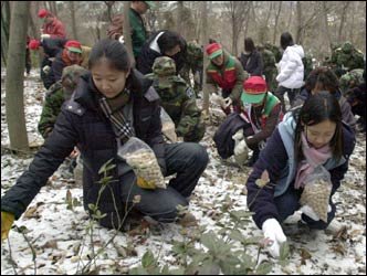 Participants in a "Wild Animal Feeding Event" sprinkle corn in Umyeonsan, Seocho-gu, Thursday, for birds, hares, and squirrels.