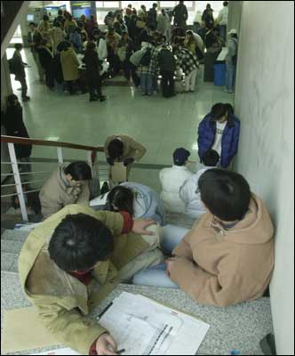 Applicants fill the aisles of the admissions building of Korea University's affiliated College of Health Sciences, writing applications form Friday, the admission deadline.
