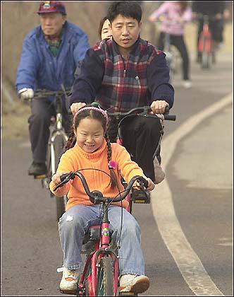Enjoying the continued warm winter weather after a prolonged cold spell, Ilsan residents ride bicycles at the Lake Park, Sunday.