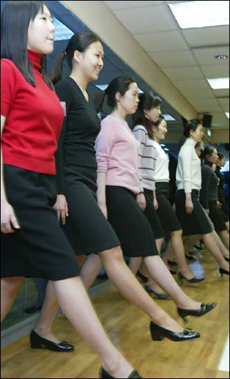 Some 90 college students and those who will enter college next year practice walking at Flight Attendance Experience Program held at Asiana Air Training Center, Gangseo-gu, Seoul, Monday