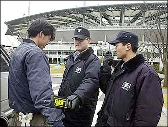Police officers run metal detector checks on people before they can enter the Sangam Stadium Wednesday as the ten World Cup Venues were placed on a 24-hour security alert status as of 8:00pm Tuesday.