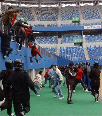 Police block "hooligans" from running on to the pitch at Daejon World Cup Stadium, Tuesday, during "anti-hooligan" training.