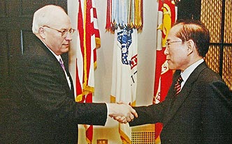 Grand National Party leader Lee Hoi-chang shakes hands with US Vice-president Richard B. Cheney at the White House Friday (KST) during his US visit.