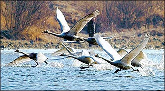 Winter migratory whistling swans, designated as Natural Monument No. 201, make a splash in Namhan River, Wonju City, Gangwon Province, Sunday.